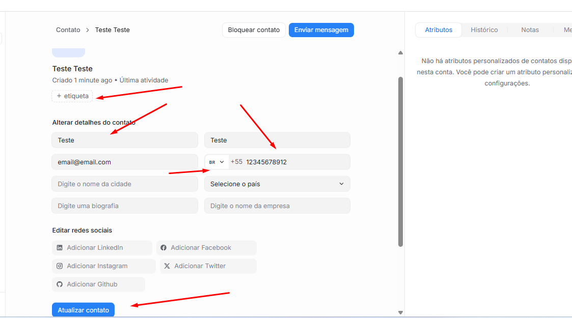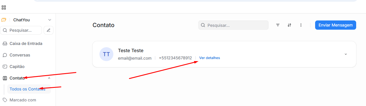 Para atualizar um contato, vá até a aba "Contato" > todos os contatos > escolha o contato e depois clique em "Ver detalhes"