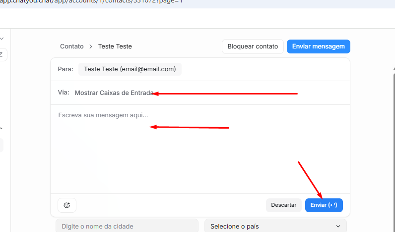 Na nova tela, escolha de qual caixa de entrada você deseja enviar a mensagem, digite sua mensagem no campo de mensagem e depois clique em Enviar.