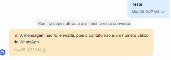 Se o número for inválido, o sistema poderá emitir um alerta dentro da conversa.